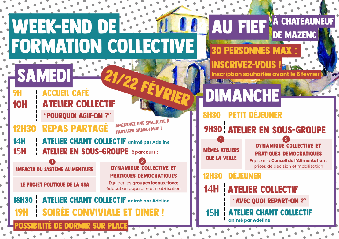 - Questionner et renforcer notre dynamique collective et nos pratiques démocratiques : ce module sera animé par notre formatrice Adeline de Lepinay (www.education-populaire.com). Il s'adressera le samedi aux cotisants et membres des groupes locaux-loco autour des missions de mobilisation et d'éducation populaire. Le dimanche, ce module s'adressera aux membres du Conseil de l'alimentation qui se réuniront pour la première fois, en mettant l'accent sur le fonctionnement du groupe et les processus de prise de décision. Il s'adresse également aux cotisants intéressés pour y participer temporairement au sein de groupes de travail.